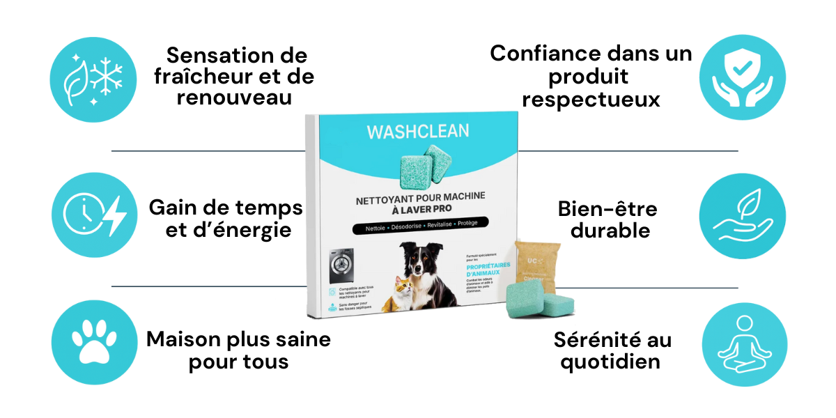 Dès la première utilisation, WashClean élimine les résidus, neutralise les mauvaises odeurs et laisse votre machine parfaitement propre et fraîche.